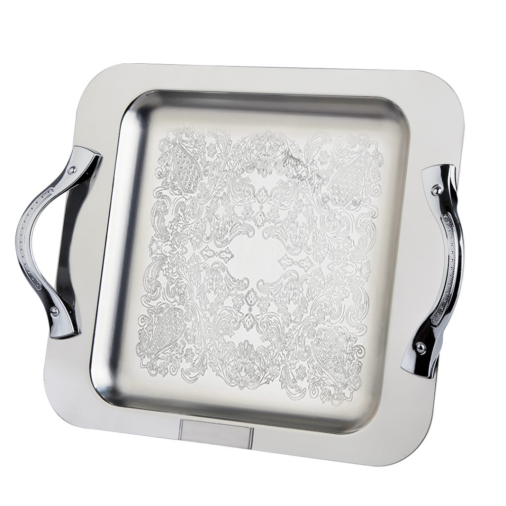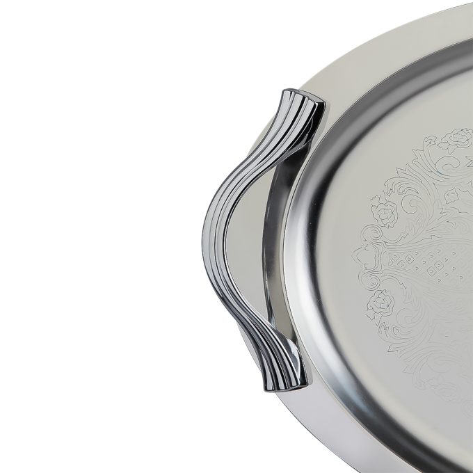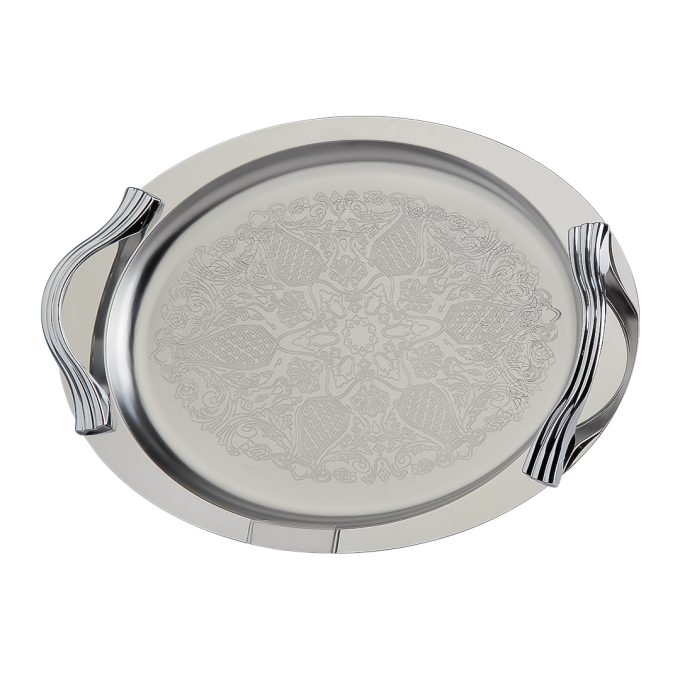 دسته نگین دار: این سینی از دستههای نگین دار برخوردار است که نه تنها به زیبایی آن افزوده است بلکه جابجایی آن را نیز راحتتر میکند. با استفاده از این دستهها، میتوانید به راحتی سینی را از جایی به جای دیگر ببرید.